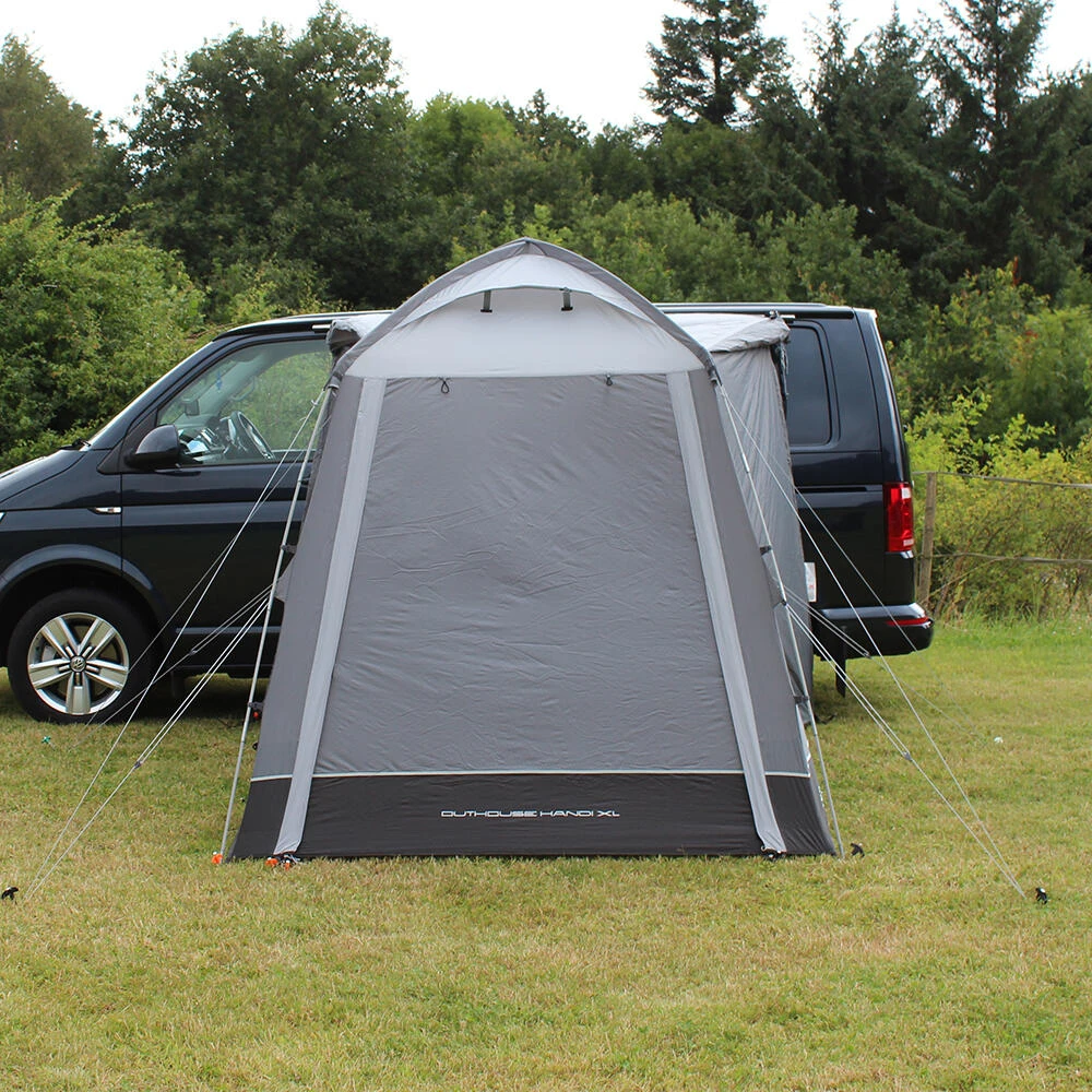 This bestselling lightweight pole-and-sleeve driveaway awning functions as a compact multi-purpose utility tent, which can be fixed alongside a campervan or motorhome and carries freestanding capabilities. A perfect addition to any touring arrangement, granting an indispensable extension of usable space, making it perfect for use as a dining, cooking, relaxation, storage, pets, toilet or shower area. Now available in 2 ergonomic cowl sizes to fit a vehicle rail height of up to 255cm, the Outhouse Handi is very simple to pitch using just 2 robust fibreglass poles. We have introduced crystal clear window panels and mesh ventilation points on both sides of the awning to maintain an airy internal space, and a separate peg-down groundsheet giving the option to remove if desired. Exterior zip-down storm covers help to ensure maximum protection against the elements throughout adverse weather conditions, whist roof ventilation points ensure airflow is maintained to reduce condensation. A stylish front canopy can be created using optional canopy poles (available separately), and the internal area can be illuminated in the evening using our optional Lumi-Link lighting system which velcros simply into place. Fixing Height 210cm – 255cm (Mid) • 120HDE high density all-weather lightweight fabric