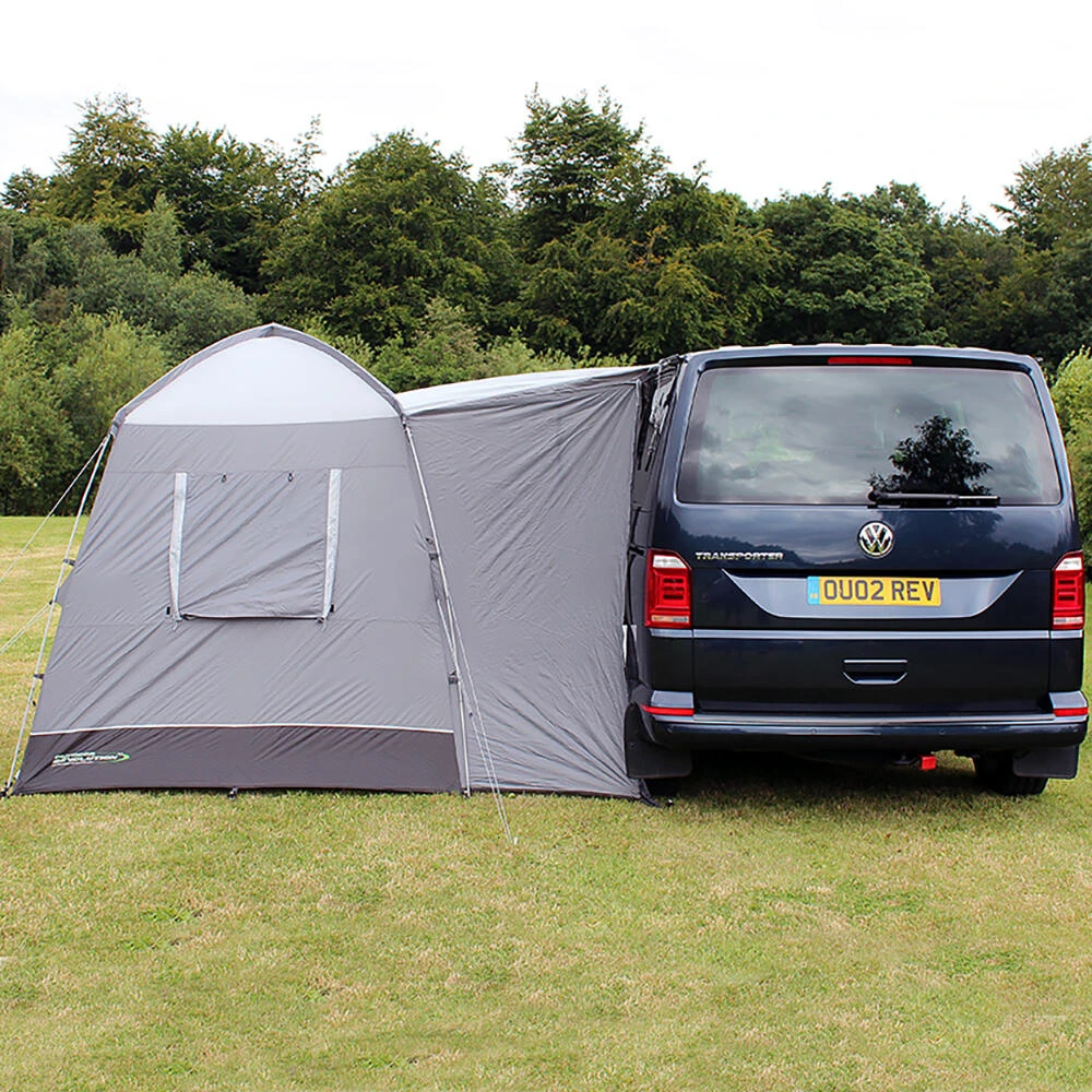The bestselling lightweight Cayman Outhouse Handi pole-and-sleeve driveaway awning functions as a compact multi-purpose utility tent.